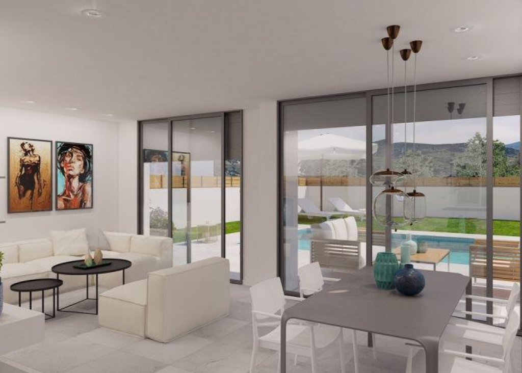 VILLA MODERNA ENTRE MAR Y MONTANA Fantastico Chalet de Obra nueva construido sobre una parcela de 400m2 en Aspe. El chalet tiene una superficie construida de 140.17m2, en una sola planta, con un porche de 19.20m2, un salón-comedor-cocina de 41.50m2, 3 dormitorios, 2 baños, una galería y un solarium de 27.55m2. Incluido en el precio: Electrodomésticos: vitrocerámica, horno, extractor, lavavajillas, frigorífico y lavadora. Aire acondicionado con bomba de calor, instalación + máquina Baños con mueble de baño con espejo, mampara y grifería Cocina con muebles blancos y granito nacional Led interior en toda la vivienda y en el porche Doble acristalamiento, puertas interiores y armarios empotrados blancos. Pavimento alrededor de la vivienda y piscina y zona de aparcamiento de vehículo, grava, céspes y plantas. Puerta de vehículos puerta automática y puerta peatonal. Piscina Si buscas un entorno tranquilo, cerca de pueblos tipicos españoles, rodeado de montañas y a unos 30 minutos del mar, esta es tu casa!