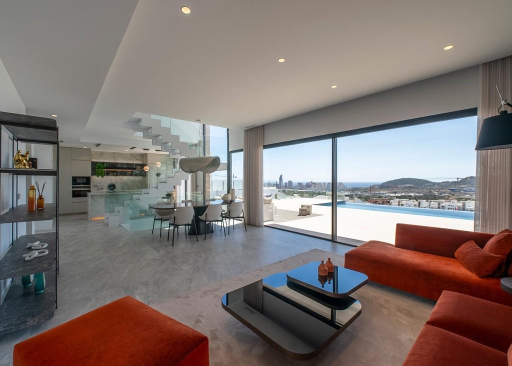 VILLAS DE LUJO DE OBRA NUEVA EN FINESTRAT CON VISTAS AL MAR Villas de lujo ubicadas en complejo residencial Obra Nueva en Finestrat. Estas villas constan de dos plantas, solárium, sótano y jardín interior con piscina privada. Cada villa tiene su propio ascensor. El solárium ofrece una vista amplia e inolvidable de Benidorm y el mar. Estas villas son únicas por su diseño y comodidades: una gran sala de estar, amplios dormitorios en suite en el primer piso, un solárium para relajarse y disfrutar de los atardeceres, una piscina infinita contemporánea y una gran terraza para vacaciones y relajación. Residencial situado a 5 min en coche de todos los servicios que ofrece Benidorm y en un entorno con una temperatura media anual de 20ºC y 300 días de sol al año, a 44 km del aeropuerto de Alicante, a 3 km del mar y a 200 metros del golf.