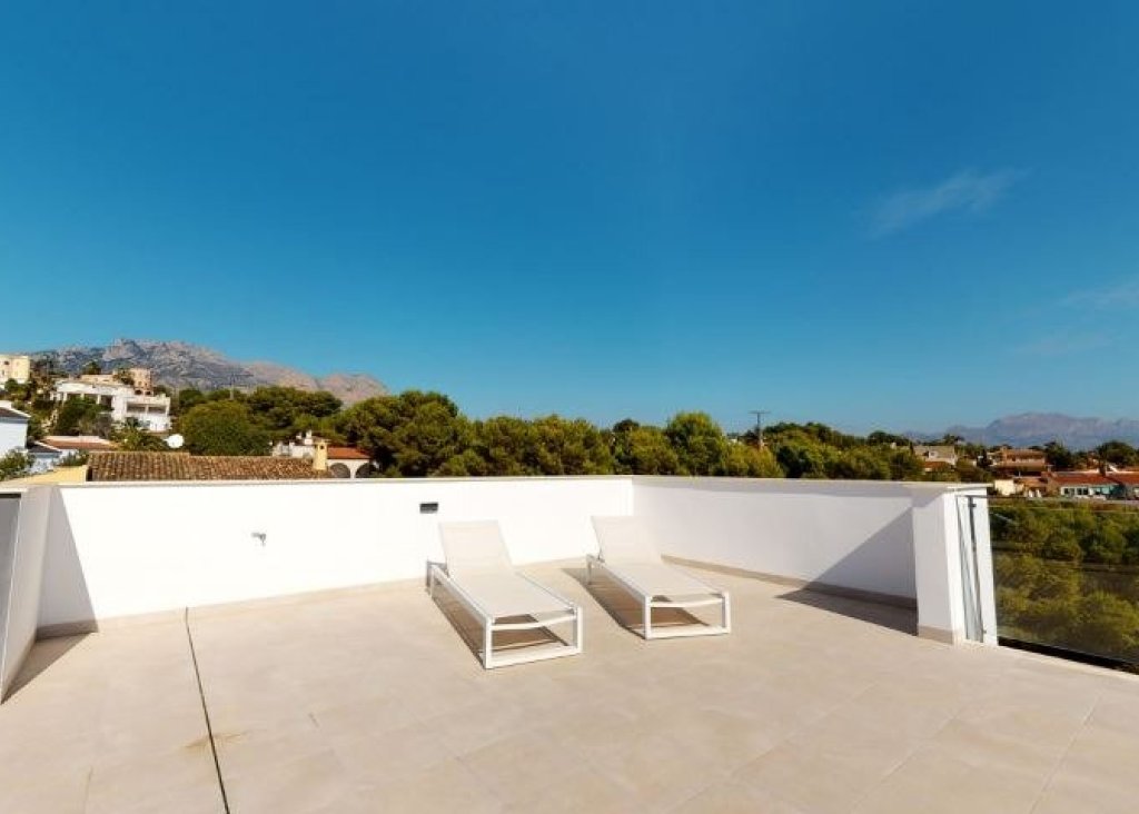 NEW BUILD VILLAS IN LA NUCIA New Build Residential of comfortable and luxurious villas with private pools in La Nucia. Villas consist of 3 large double rooms with fitted and lined wardrobes.One room is on the ground floor and the other two on the first floor. It consists of 4 completely finished bathrooms with glass screens, porcelain toilets and thermostatic taps in showers, one on the first floor, another in the garage and the other 2 en suite in the rooms on the first floor. Bright living room with large windows that give access to the private plot with pool and artificial grass where you can enjoy and relax. Fully equipped American kitchen with wall and base units, high-end appliances and an island with base units, SILESTONE countertop with built-in stainless steel sink and designer stainless steel extractor hood. Installation of Air Conditioning and Heating through AEROTHERMAL ducts with 2 independent machines (dual zone). Comfort and design PORCELANOSA provide exclusive finishes, such as floating floors, natural stone floors and top quality stoneware.The entire Villa has interior and exterior LED lighting and electric shutters. Residential located in an exclusive area of great quality and with all the comforts; terrace, solarium, private garage for 2 vehicles, garden areas, urbanization, pool and everything you can imagine. Residential committed to the enviroment , equipped with solar panels for the production of domestic hot water, LED lighting and THERMAL-ACOUSTIC insulation. La Nucía is a municipality in the comarca of Marina Baixa, Alicante. It borders the municipalities of Altea, Callosa d'En Sarrià, Benidorm, Polop and L'Alfàs del Pi. La Nucia is located in a fruit valley between Benidorm and Callosa d'En Sarrià, 3 km from the coast of Altea. The urban center is on a promontory overlooking the Mediterranean Sea, 51 km north of Alicante and 8 km north of Benidorm. DISTANCES: - Access from highway A. - 5 minutes from Terra Mitica. - 5 minutes from the ELIANS School. - 5 minutes from supermarkets, cafes and all kinds of services. - 10 minutes from Benidorm Beach. - 15 minutes from Playa del Albir. - 20 minutes from Guadalest Castle. - 40Km from Alicante-Elche Airport.