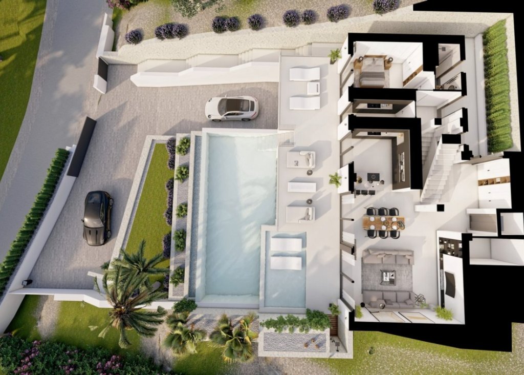 NEW BUILD LUXURY VILLA IN ALTEA Beautiful New build detached villa located in the prestigious urbanization of Altea . Fantastic villa distributed over three floors and has 4 spacious bedrooms and 5 bathrooms. On the ground floor, you find a large living room with sitting and dining areas, with a large bedroom with en suite bathroom, an open kitchen, terrace at the back of the property and a large pool deck at the front with infinity pool. On the 1st floor, you will find one spacious bedroom, 2 bedrooms with en-suite bathrooms with beautiful views of the sea and surrounding area. Bedrooms have large windows which allow a lot of natural light to come in. If you take a stairs or elevator, you can reach spacious solarium with amazing panoramic mountains and sea views and of the Altea . Altea is located 50km from Alicante, 10km from Benidorm and 130km from Valencia. The area is very well connected to highway N332 and AP7, which leads you to the airport of Alicante in aprox. 35 mins.