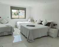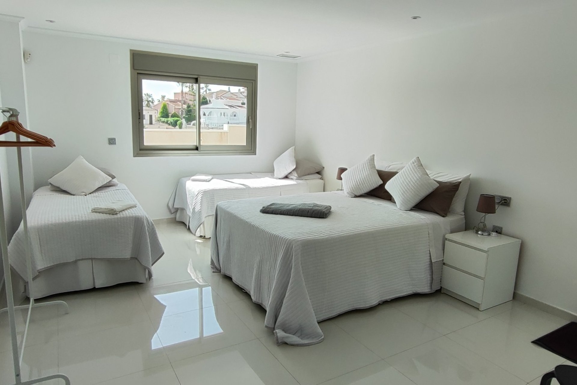 To the top floor of this magnificent villa we have a Master bedroom with fitted wardrobes, the main bed sits in the centre of the room with a half wall separating the dressing area, there is an ensuite shower room with walk in shower and patio windows opening onto the massive side terrace. The outside space of this property just keeps giving with a further staircase leading to the roof and although this is the utility area housing the air-conditioning compressors and the solar panels for hot water it is also the top of the house and a fabulous spot to sit and star gaze or watch fire works from the surrounding villages on fiesta nights.