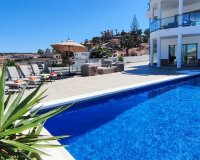 From the lounge patio doors open up onto a circular covered terrace which is used as a dining area and place to sit and relax. On this level the villa has a further bathroom with walk in shower, and a great sized double bedroom with fitted wardrobes and patio door leading to the side terrace with seating area and sunbathing spot overlooking the pool.