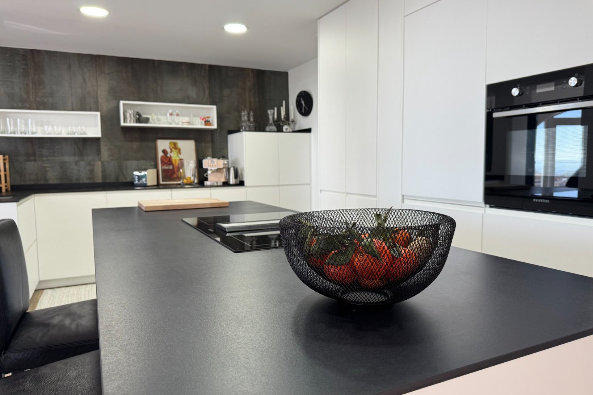 The upper floor features a spacious living-dining room with a modern kitchen and central island, offering beautiful panoramic views of the salt lake. The ground floor includes an open-plan kitchen and living area with direct access to the garden, 2 bedrooms, and a bathroom.